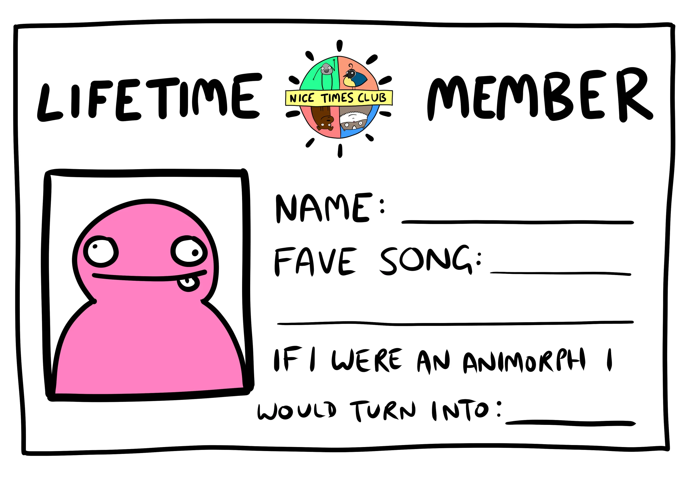 Hey, pals! Welcome to the first ever Nice Times Club! I'm up here in the Nice Times Clubhouse and oh, boy have I got a whole load of nonsense for you today. But seeing as this is the first ever convening of the Nice Times Club, there's a bit of admin to get through first. Here is your membership card: