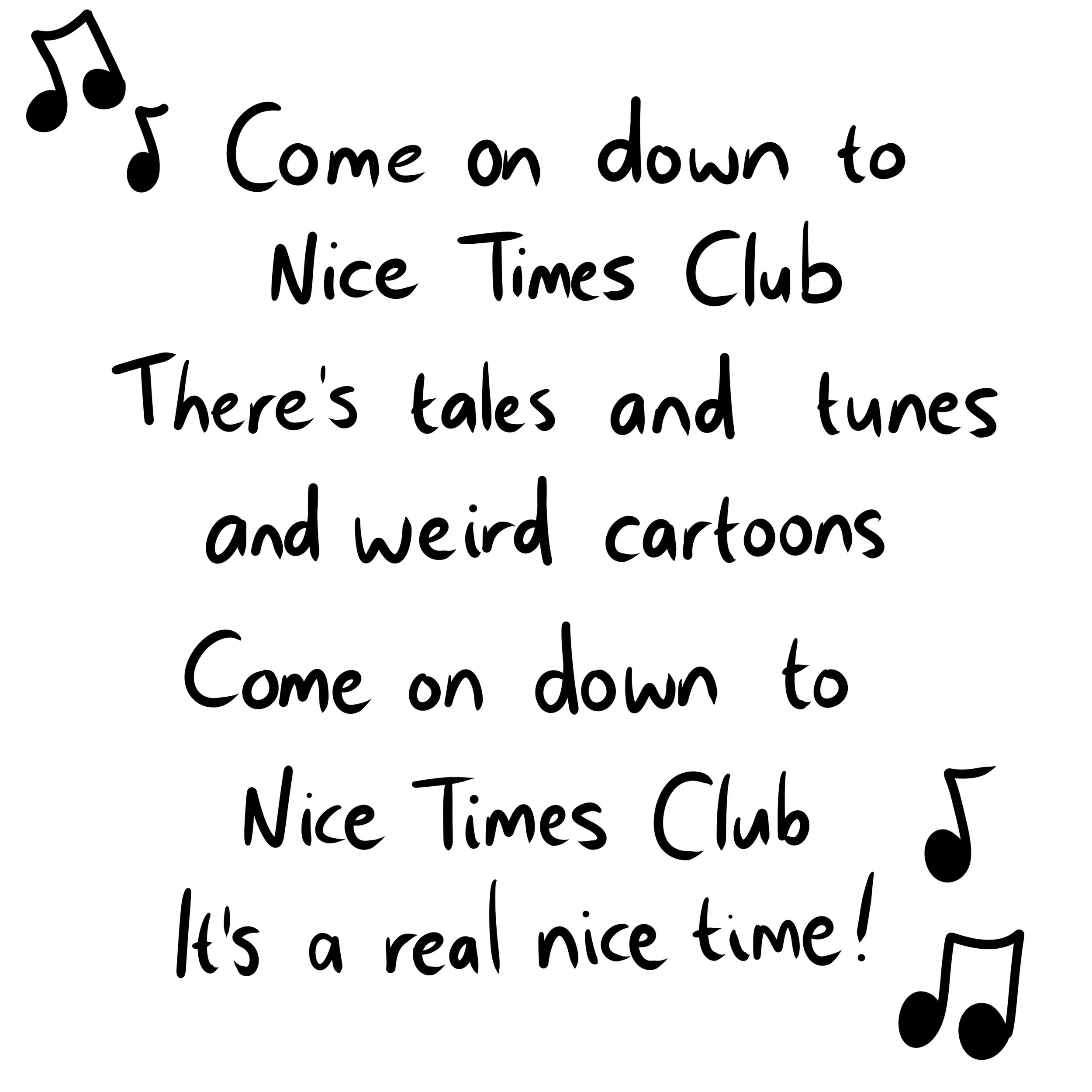 Here are the lyrics to the Nice Times Club theme song. You can put them to whatever melody you like: