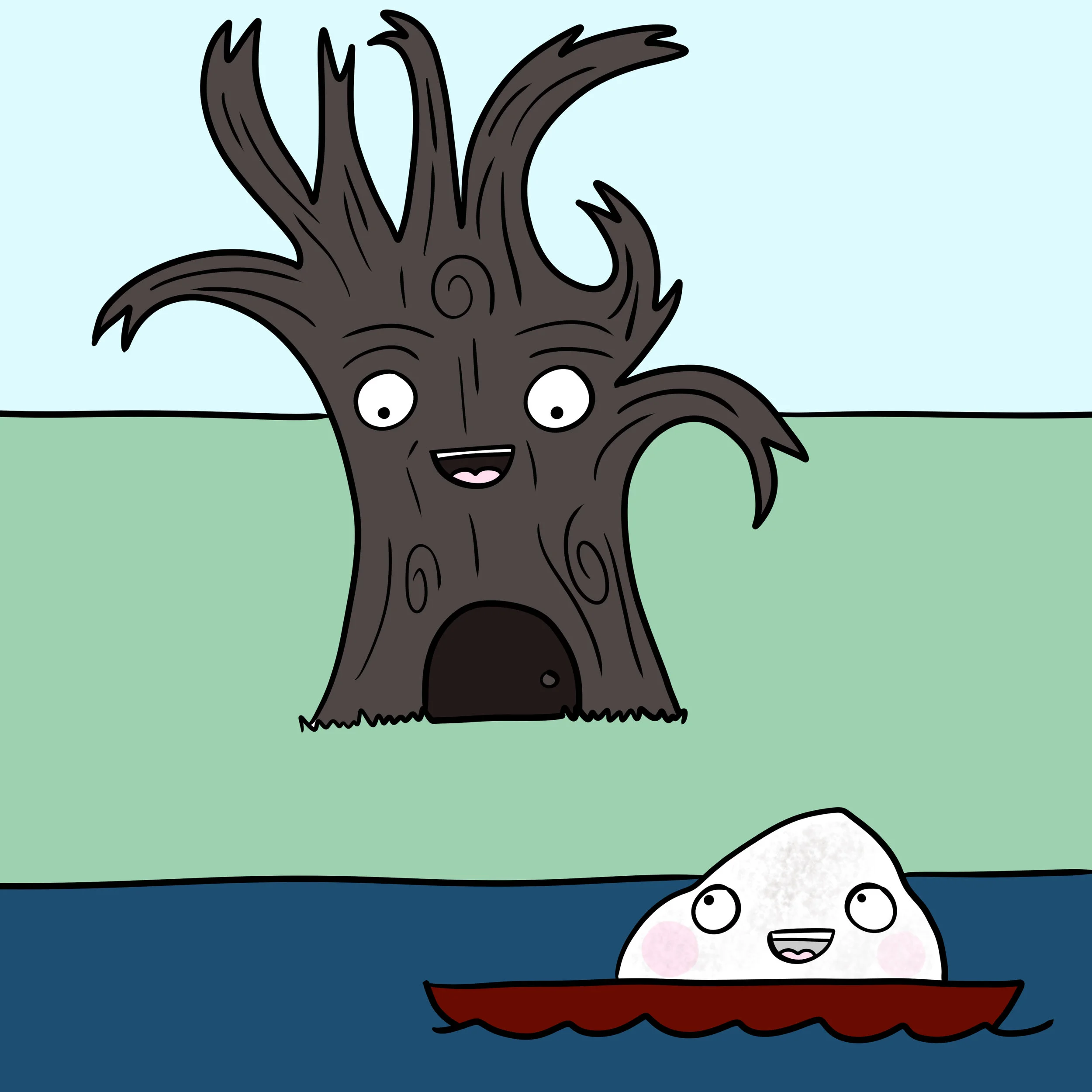 Geoff the rock decided that the time had come for him to get out and see the world. With his new long legs, there was nothing stopping him. So he packed himself a bag, picked a direction and started walking. In the distance, he spotted a weird-looking tree. It was wizened and dark and its branches curled in all kinds of ways and it was generally of a spooky disposition. But Geoff knew better than to judge a tree by its bark, so he walked right on up to it to investigate.